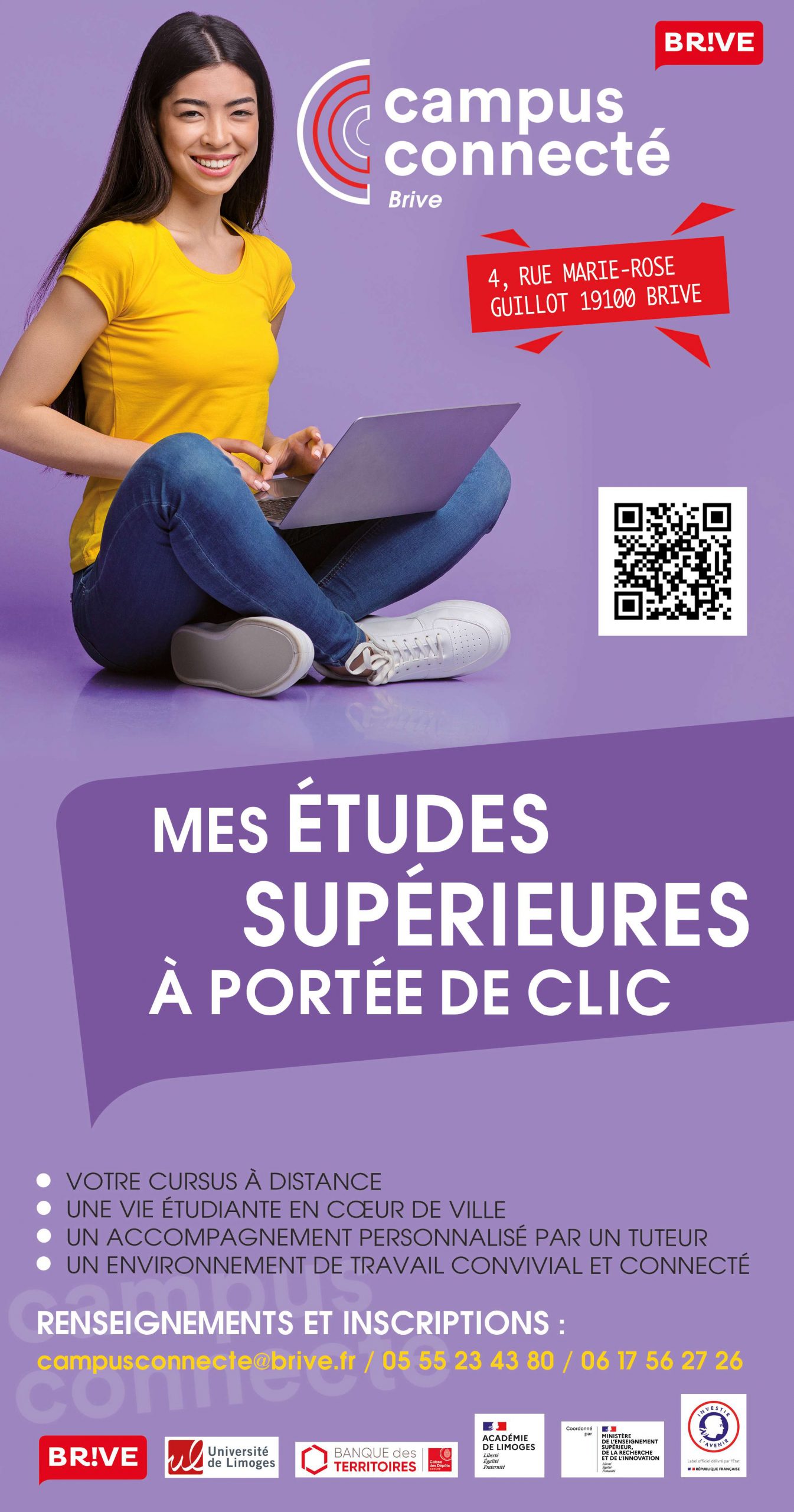 Le campus connecté c’est la possibilité de réaliser ses études supérieures à distance en plein cœur du centre-ville de Brive ! Avec l’accompagnement d’une tutrice au quotidien, votre formation est à portée de clic dans un lieu convivial et coloré propice au travail et à la réussite.
