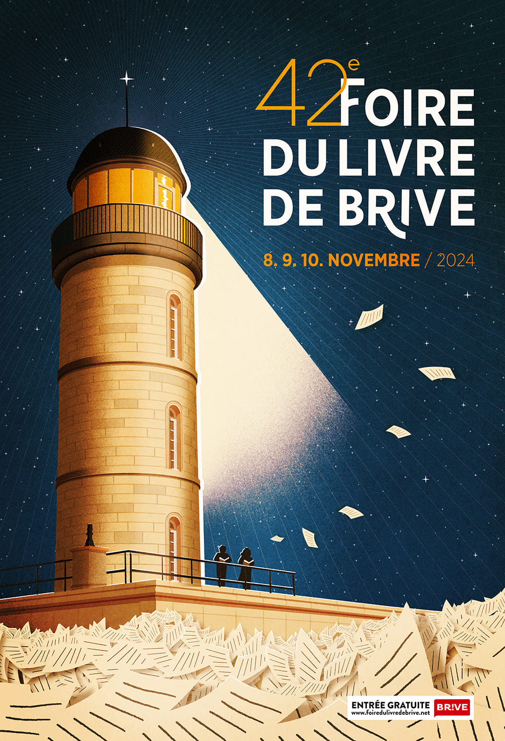 La 42e édition de la Foire du livre se déroulera les 8, 9 et 10 novembre prochains, sous la présidence du journaliste et écrivain Jérôme Garcin. Après la rivière de livres en 2023, Mathieu Persan signe cette année encore un visuel avec un ancrage fort. On y retrouve le phare de la Guierle bien connu dans la cité et le style épuré et retro qui le caractérise. Métaphorique et poétique, cette affiche fait l’éloge de la lecture qui, à l’instar du phare, montre le cap et nous élève.