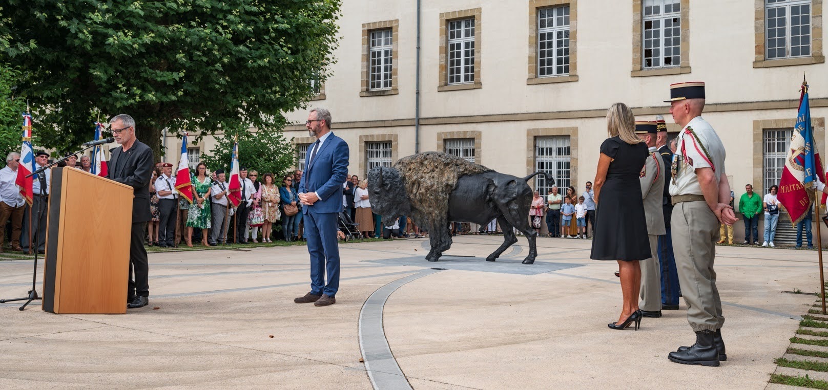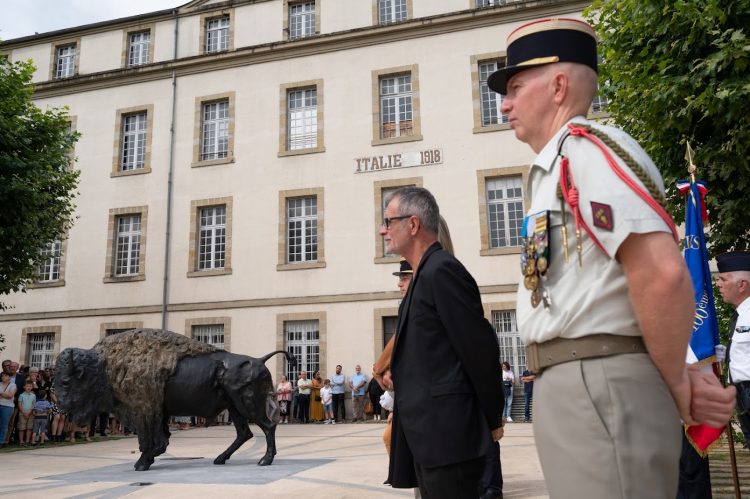 La « bête » est à taille réelle : 1,80 mètre au garrot sur près de 3 mètres de long. À l’intérieur, une structure en acier inox dont les tiges vont descendre profondément dans le sol afin de stabiliser ce bronze qui frôle la tonne et demie. Tellement monumental qu’il a été travaillé en 22 morceaux. Une œuvre pour Brive, témoignant de l’histoire du régiment d’infanterie qui y est implanté depuis 1810 et dont l’emblème est un bison blanc. Une œuvre qui va aussi faire le lien entre hier et demain, imprimant ce quartier en devenir. Qui plus est, signée par un artiste briviste. Voilà six mois que le sculpteur Pierre Mouzat s’est attelé à sa réalisation : créer l’original en miniature, puis l’agrandir à l’échelle, faire les moulages, les tirages de cire puis du bronze, remonter les éléments, souder, ciseler, patiner.